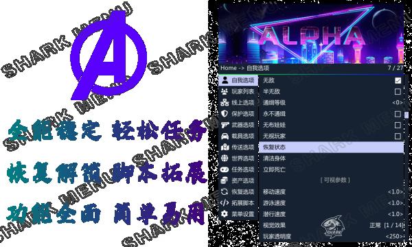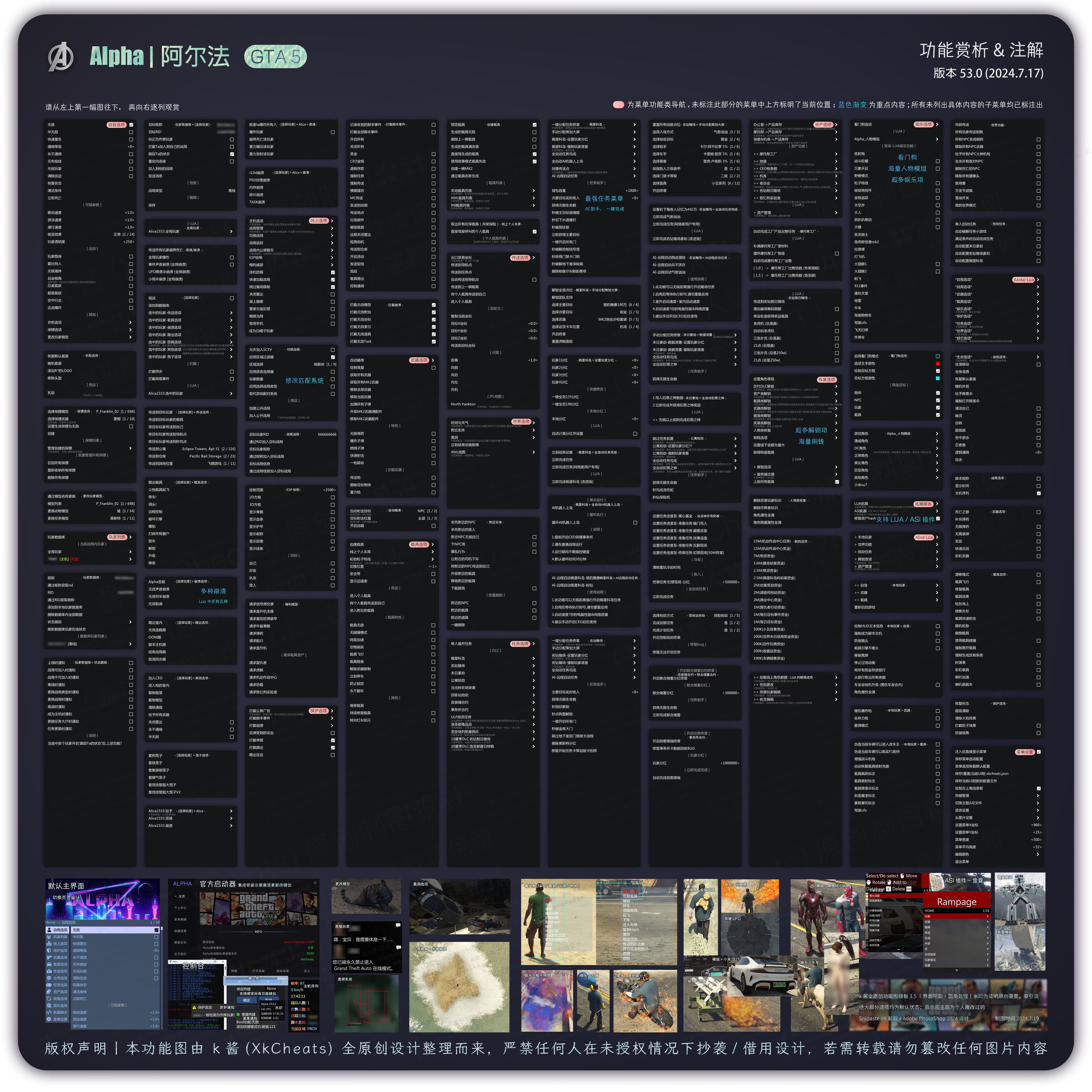 🎮 GTA5-侠盗猎车手V教程Alpha 阿尔法Alpha功能图本页总览Alpha功能图 菜单列表 菜单功能图 success查阅功能图时 手机用户:推荐点击打开图片,长按并保存至相册内查看 电脑用户:可通过下方链接下载功能图并解压查看,或点击图片右键另存为本地查看 功能图下载 特色 价格 价格: 传承版:98¥ 增强版:160¥ 定位 定位:养老/任务 部分功能视频展示