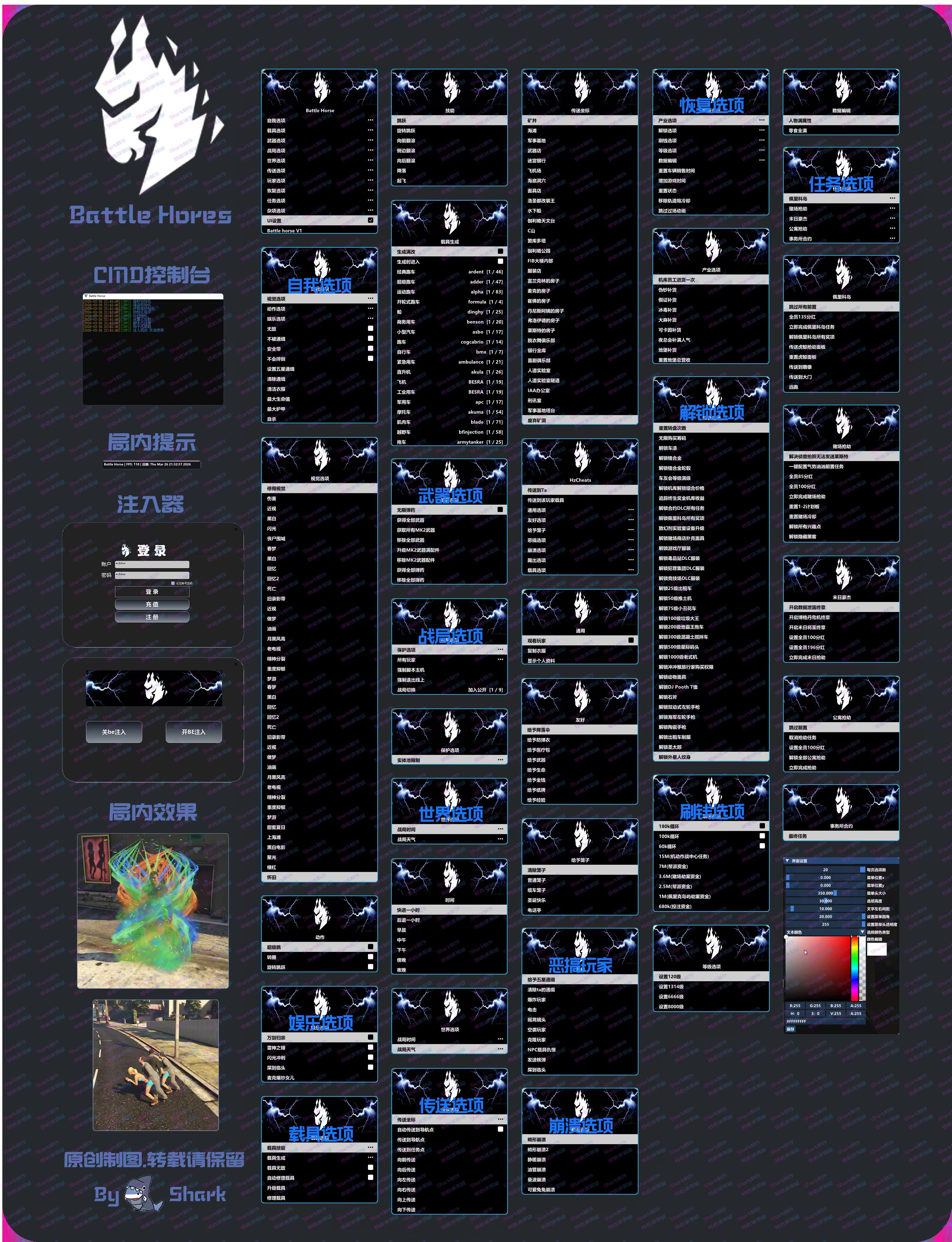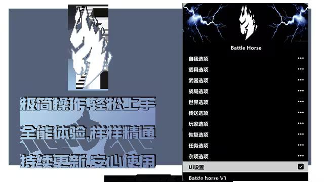 🎮 GTA5-侠盗猎车手V教程Battle Horse 战马Battle Horse功能展示本页总览Battle Horse功能展示 菜单列表 菜单功能图 提示查阅功能图时 手机用户: 推荐点击打开图片,长按并保存至相册内查看 电脑用户: 可通过下方链接下载功能图并解压查看&点击打开图片,右键另存为电脑内查看 价格 价格永久98¥ 定位 信息定位:防护/养老/任务 局内截图展示 SOON 📺 视频演示 SOON