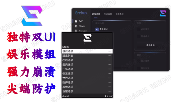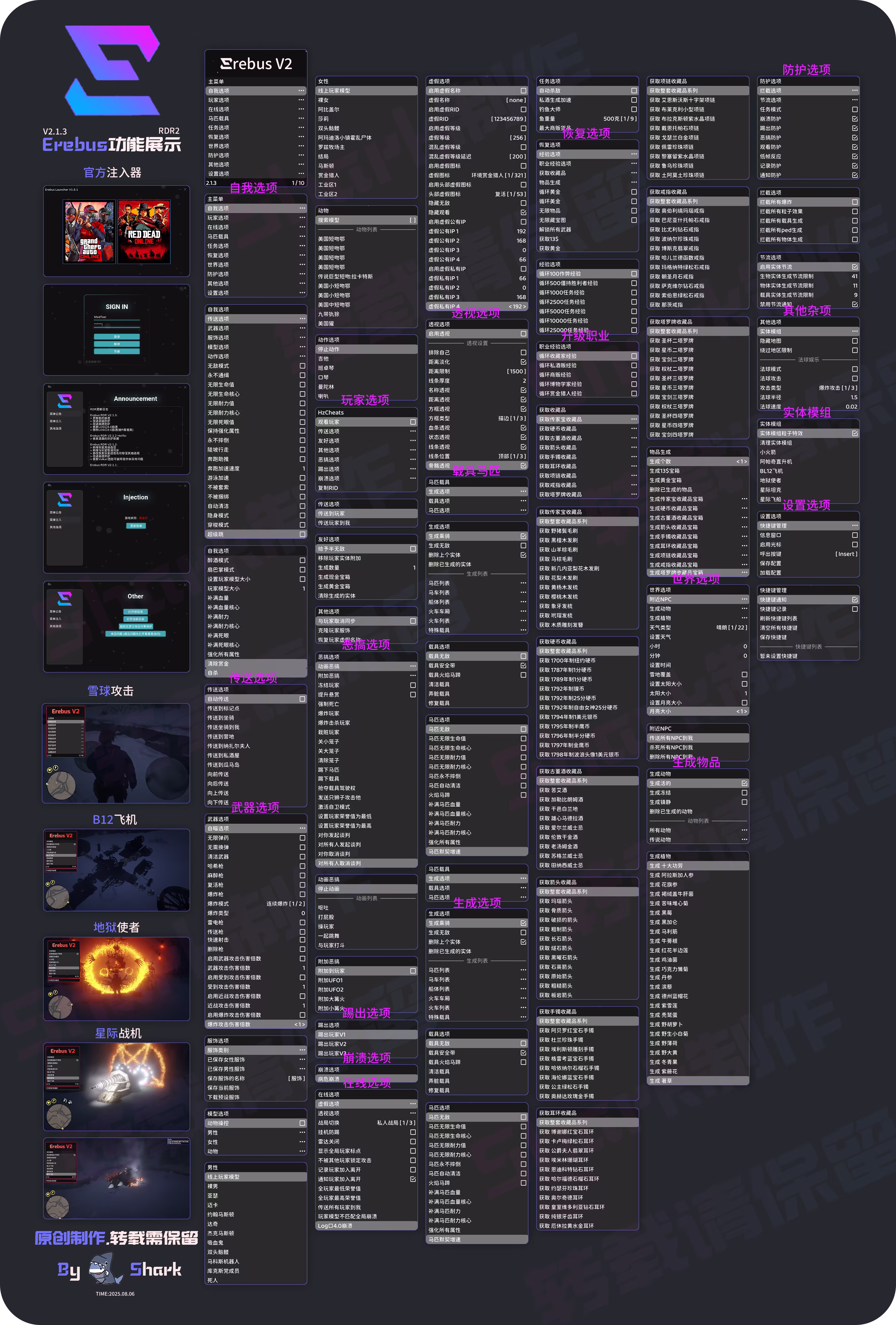 🎮 GTA5-侠盗猎车手V教程Erebus 菜单Erebus功能图本页总览厄里斯功能图 信息Erebus 每款菜单都需要单独购买,并不是一个激活码通用所有游戏。 菜单列表 菜单功能图 提示查阅功能图时 手机用户: 推荐点击打开图片,长按并保存至相册内查看 电脑用户: 可通过下方链接下载功能图并解压查看,或点击打开图片,右键另存为电脑内查看 GTA5增强版GTA5传承版RDR2-Erebus下载地址:https://shark.lanzouu.com/b013k4ywf(如有传承版功能图可在此补充)下载地址:https://shark.lanzouu.com/b0izqn4da