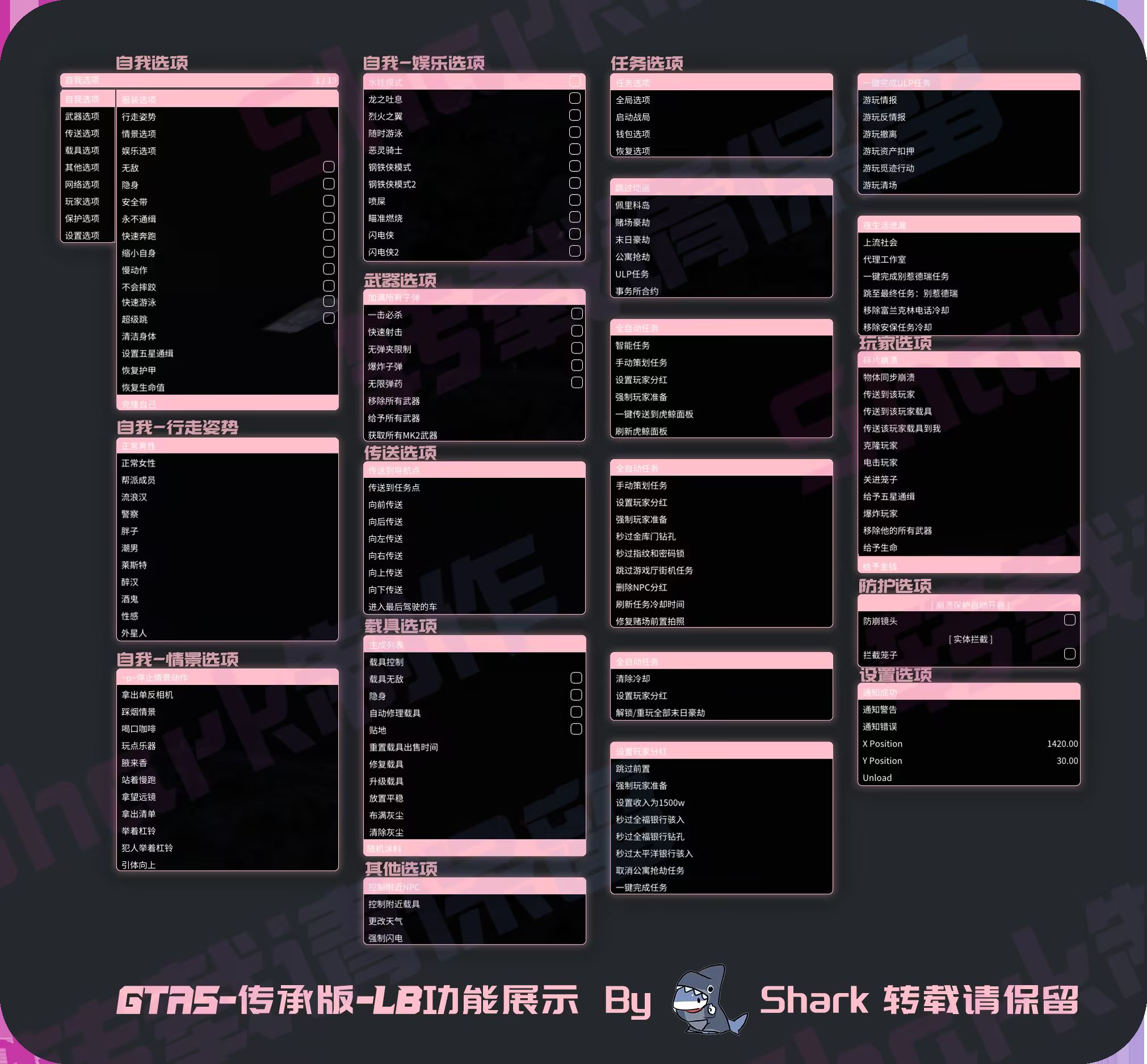 🎮 GTA5-侠盗猎车手V教程LB 菜单LB功能展示本页总览LB 功能展示 菜单列表 菜单功能图 提示查阅功能图时 手机用户: 推荐点击打开图片,长按并保存至相册内查看 电脑用户: 可通过下方链接下载功能图并解压查看,或点击打开图片,右键另存为电脑内查看 下载地址:https://shark.lanzn.com/b0j0t5fwb 特色 (此处可补充特色介绍) 价格 信息价格:传承版:100¥ 定位 信息定位:防护/养老/任务 部分功能视频展示 (如有视频或图片可在此补充)