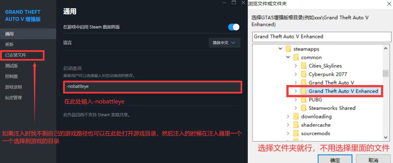 首先打开STEAM或者EPIC平台,右键GTA5增强版,点击属性,选择浏览本地文件,在本地文件中找到version.dll这个文件(使用此注入方法,如果没有也正常,因为无FSL注入会自动帮你删除version.dll这个文件,但是有些人电脑杀毒拦截会导致这个文件没被安装器自动删除),删除这个文件,确保游戏目录中没有这个文件后,找到高级启动选项设置,删除-nobattleye代码,然后重启电脑,重新打开游戏后你就是绿色玩家了,请注意以上步骤与顺序一定不要搞错。