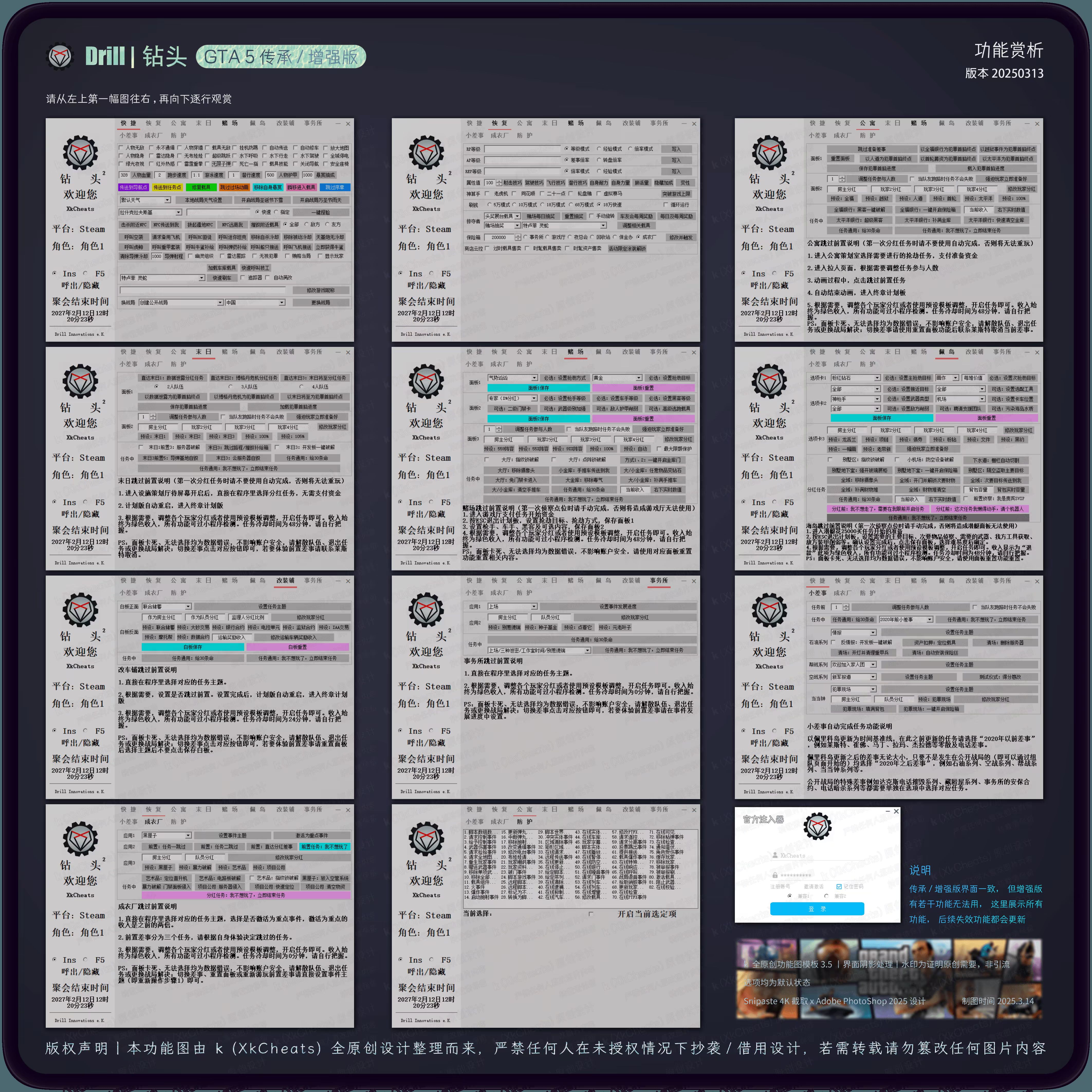 🎮 GTA5-侠盗猎车手V教程钻头 ZT钻头功能图本页总览钻头 功能图 信息游戏版本支持: GTA5传承版 / GTAV增强版一卡通用,一次购买畅玩双版本 菜单列表 菜单功能图 提示查阅功能图时手机用户:推荐点击打开图片,长按并保存至相册内查看电脑用户:可通过下方链接下载功能图并解压查看&点击打开图片,右键另存为电脑内查看 链接:https://shark.lanzouu.com/b0j0e70md 特色 价格 价格:100¥ 定位 定位:养老/任务 部分功能视频展示