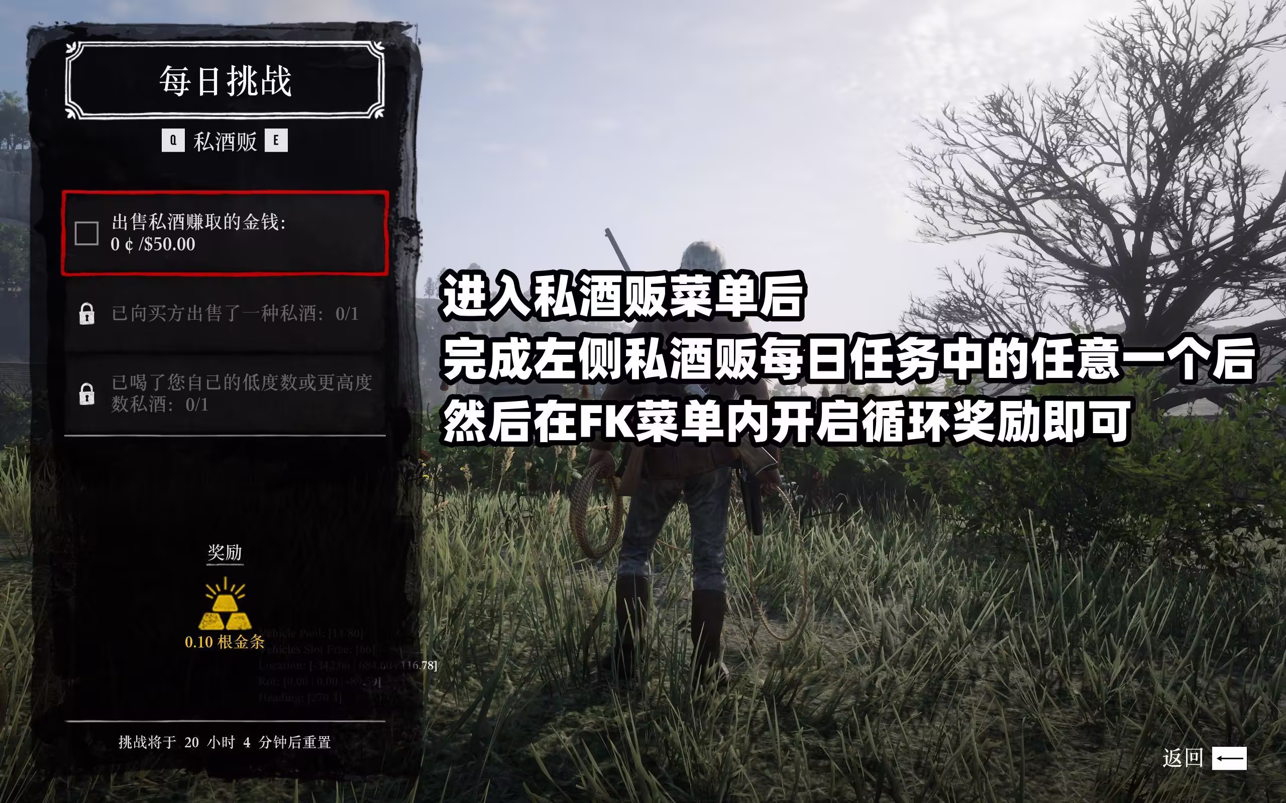 🤠 RDR2-荒野大镖客II教程FikitFK职业等级教程FK刷私酒贩等级教程本页总览FK刷私酒贩等级教程 循环奖励 危险因作者做了限制,周卡用户无法使用循环奖励功能此功能仅支持FK永久卡用户使用周卡用户可下拉查看方法2 通过宝箱获取 完成每日任务后,在 FK 主菜单内进入职业选项 - 开启循环奖励 - 挂机即可 危险(如果没完成对应的每日任务,开启循环奖励是没有效果的) 方法2-加速私酒 危险因作者做了限制,周卡用户无法使用私酒加速功能此功能仅支持FK永久卡用户使用教程制作中,建议先使用方法1最为便捷