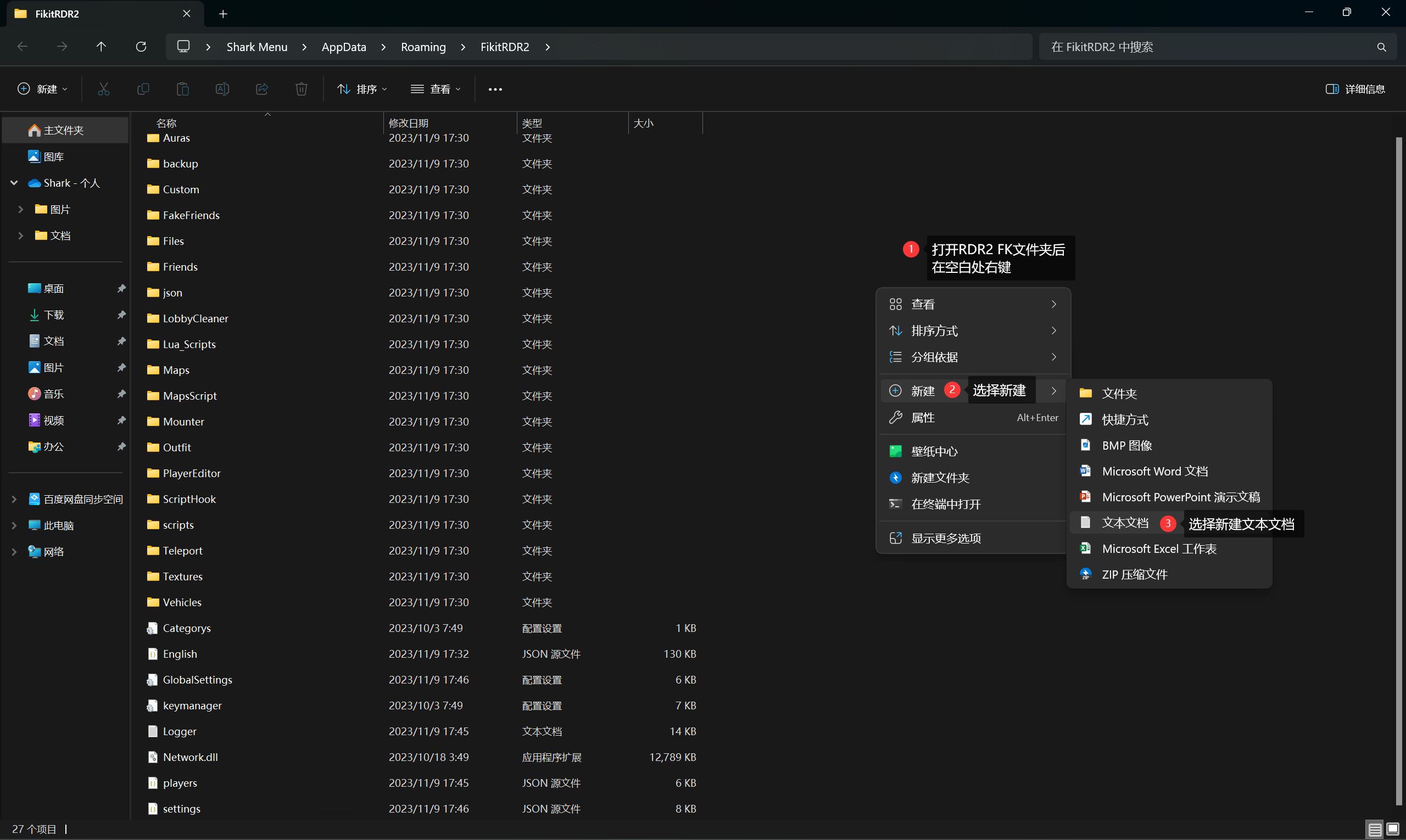在文件夹内空白处右键,新建一个 TXT 格式的文本文档,无需在文档内填写任何内容