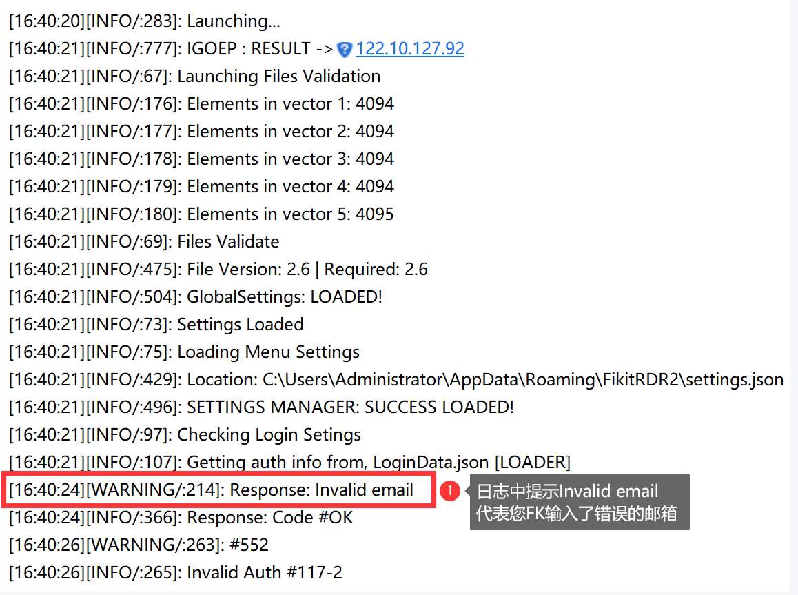 日志中如果出现下图提示:即代表FK邮箱或密码错误